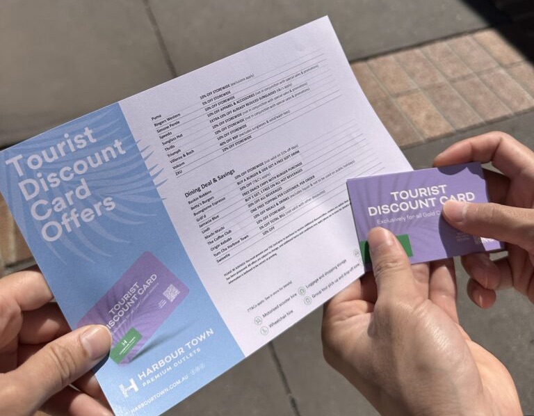 Harbour Town Gold Coast では、地域からの訪問者向けに、Tourist Discount Cardを無料配布しています。 このカードを提示することで、通常よりさらに割引されたアウトレット価格から、さらに追加の割引やお得な特典を受けられる店舗があります