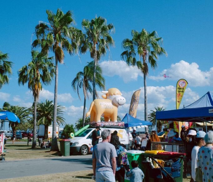 多彩なフードトラックや屋台が並び、オージーフードや国際的な料理を味わえます。雑貨やハンドメイドのお店もチェックポイント。