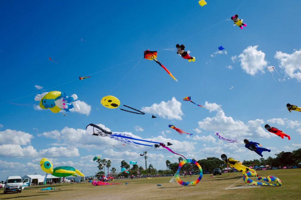 カラフルで巨大な凧が青い空に舞う光景は絶景でした。